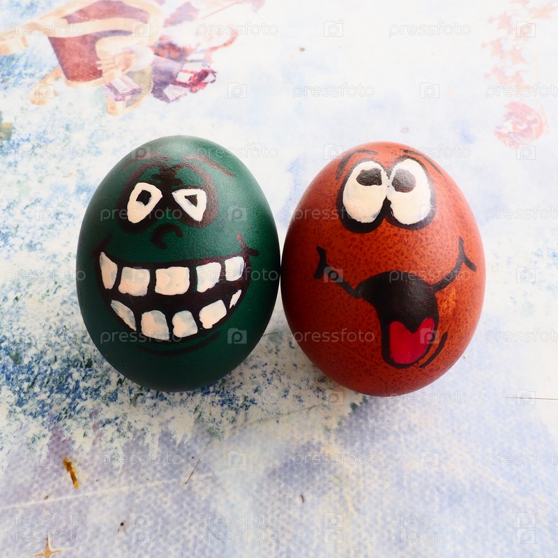 Пасхальные яйца, окрашенные в зеленый и коричневый цвета, с нарисованными смеющимися лицами. Смешные гримасы с глазами, языком и большими белыми зубами. Страшное лицо на Хэллоуин. Смайлик на Пасху. Светлый абстрактный фон