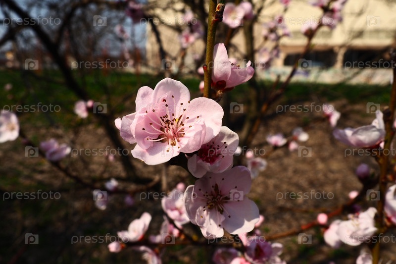 Крупные розовые цветки сливы, персика или абрикоса в период цветения садов. Солнечная весенняя погода. Цветущий сад в Сербии. Много цветов на ветвях