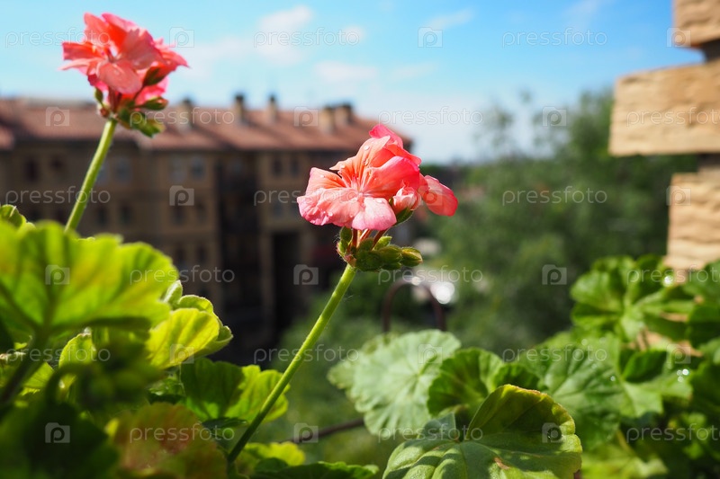 Розовые зональные гераны на подоконнике. Pelargonium peltatum вид пеларгоний, известный под общим названием Pelargonium grandiflorum. Cranesbill или журавлиный клюв. Зеленые листья