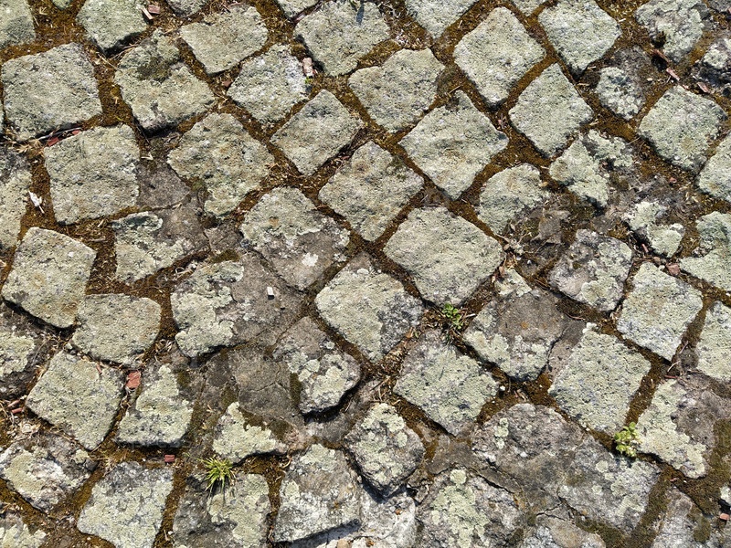 Диагональные мощеные серые тротуарные плиты или камни для пола, стены или дорожки. Традиционный забор, двор, задний двор или дорожное покрытие. Старые квадратные булыжники, заросшие травой и мхом