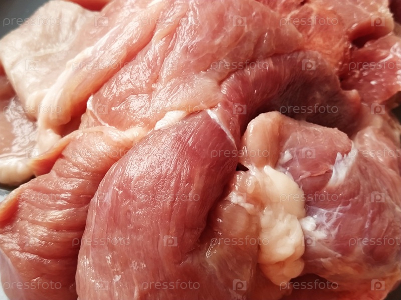 Сочный большой кусок свинины на серой поверхности. Мясо размороженное или приготовленное на пару, из которого вытекает кровяной сок. Вкусное свежее мясо для резки и приготовления пищи