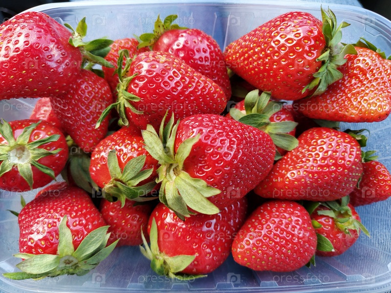Свежая клубника в прозрачном пластиковом контейнере. Красивые красные ягоды садовой клубники