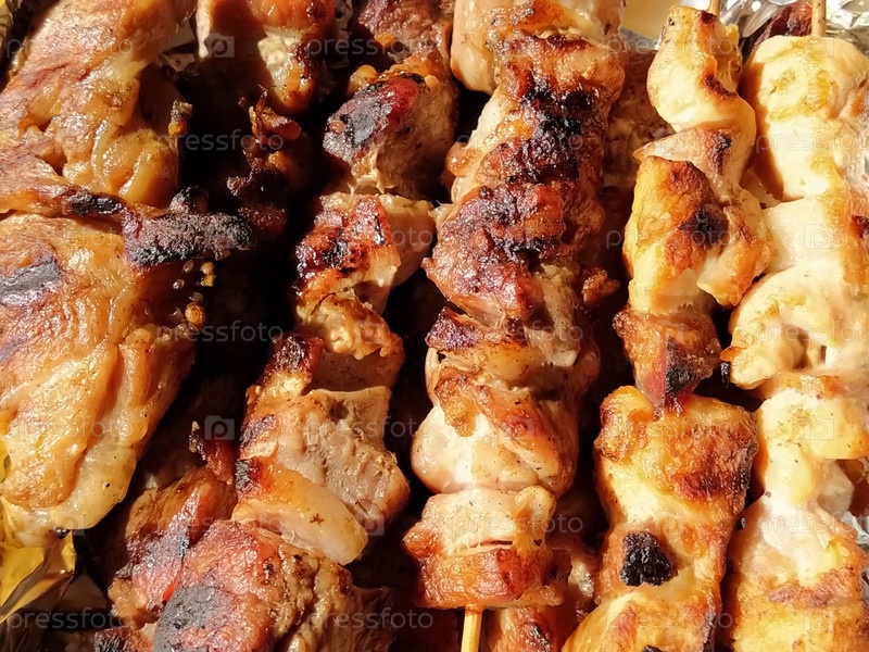 Жареная курица, шашлык из свинины на палочках. Еда из ресторана. Блюдо в одноразовой пластиковой упаковке. Котлеты из говядины, чевапы. Доставка еды во время самоизоляции