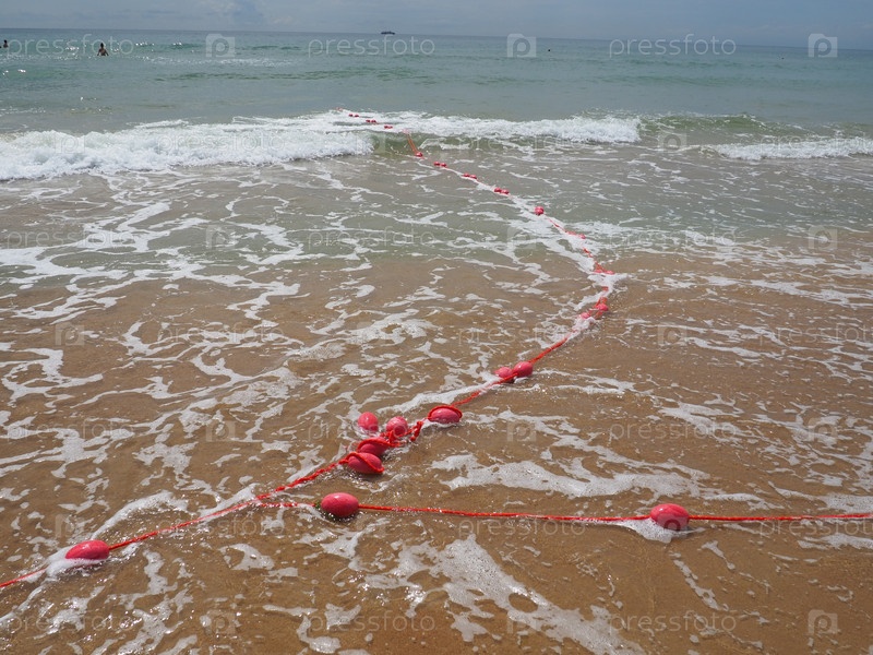 Буи на веревке в морской воде. Спасательные круги — это розовые ограничители, предупреждающие людей о глубине воды. Спасение утопающих. Разграничение места на песчаном пляже между отелями. Волна с пузырьками