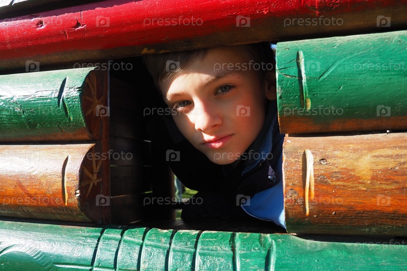 10-летний кавказский мальчик со светлыми волосами и серыми глазами выглядывает из окна деревянного дома на детской площадке. Пикабу. Ребенок спрятался. Красивое лицо