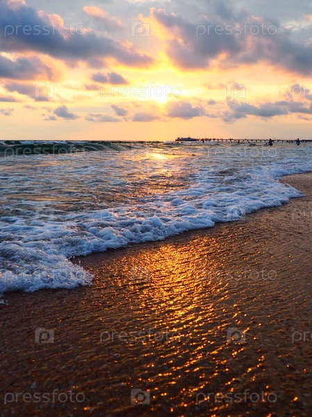 Закат над морем. Красивый закат. Пенные волны перекатываются по песчаному берегу. Витязево, Анапа, Черное море. Туристическая Мекка, курорт. Красочные облака в вечернем небе. Лучи отражаются от воды