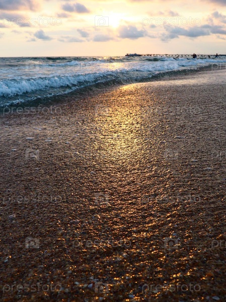 Закат над морем. Красивый закат. Пенные волны перекатываются по песчаному берегу. Витязево, Анапа, Черное море. Туристическая Мекка, курорт. Красочные облака в вечернем небе