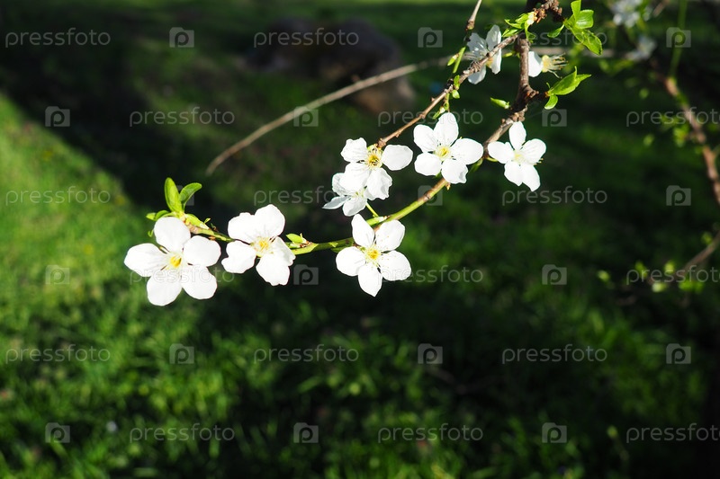Цветение вишни, черешни и черемухи. Красивые ароматные белые цветы на ветвях. Цветки собраны в длинные густые поникающие кисти. Март, Сербия, Сремска-Митровица