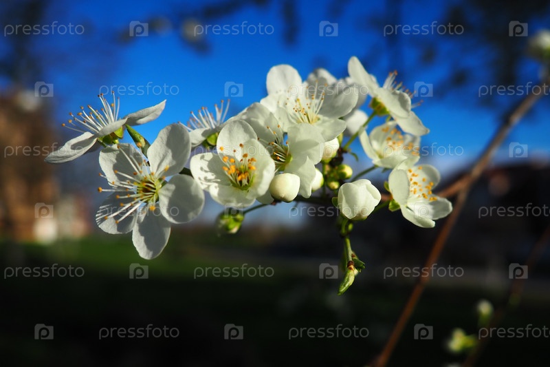 Цветение вишни, черешни и черемухи. Красивые ароматные белые цветы на ветвях. Цветки собраны в длинные густые поникающие кисти. Март, Сербия, Сремска-Митровица