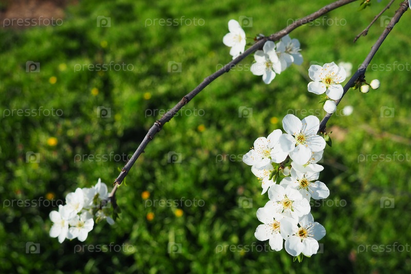 Цветение вишни, черешни и черемухи. Красивые ароматные белые цветы на ветвях. Цветки собраны в длинные густые поникающие кисти. Март, Сербия, Сремска-Митровица