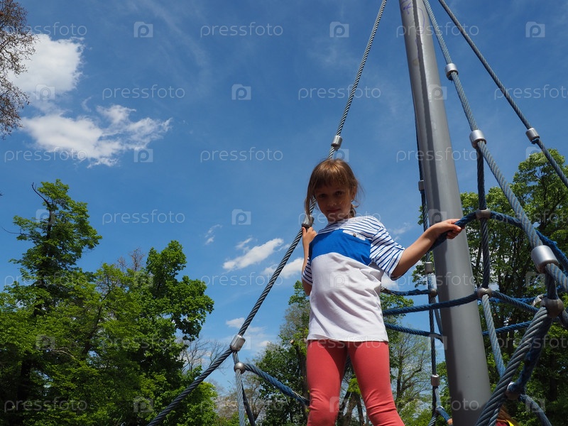Привлекательная маленькая девочка на оборудовании для открытых площадок. девушка на детской площадке. 7-летний ребенок в бело-голубой футболке и розовых штанах лезет в паутину