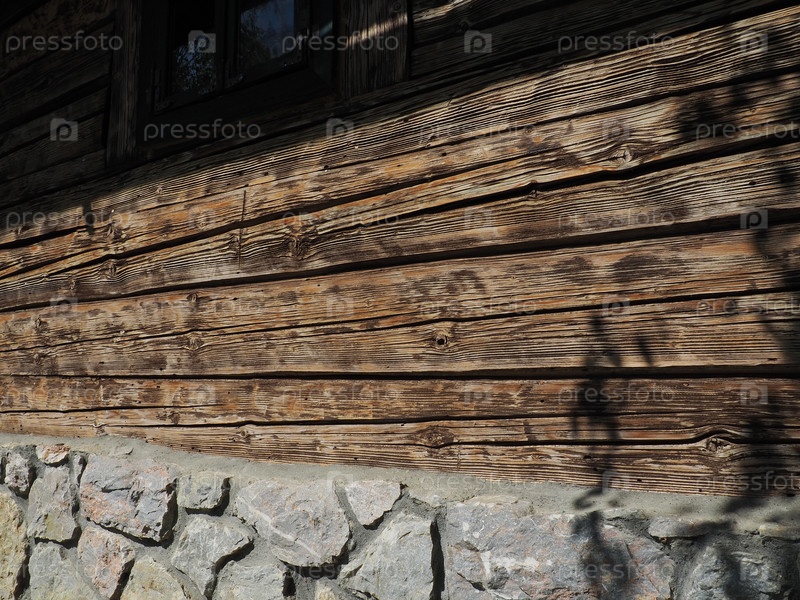 Бревенчатая деревянная стена старого деревенского дома. Булыжный фундамент. Старые методы строительства жилых домов