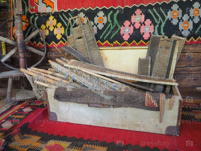 Старинные инструменты для ковроткачества. Ковроткачество в Сербии и Боснии. Сундук ручной работы с деревянным каркасом, ножная прялка. Стена бревенчатого дома с красочными коврами. Старинная крестьянская тема. Работа и хобби
