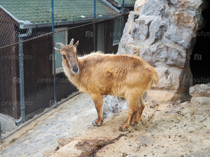 Гималайская смола. млекопитающее семейства полярных, род тара, Hemitragus jemlahicus. гималайский тар в зоопарке с большими рогами смотрит в камеру