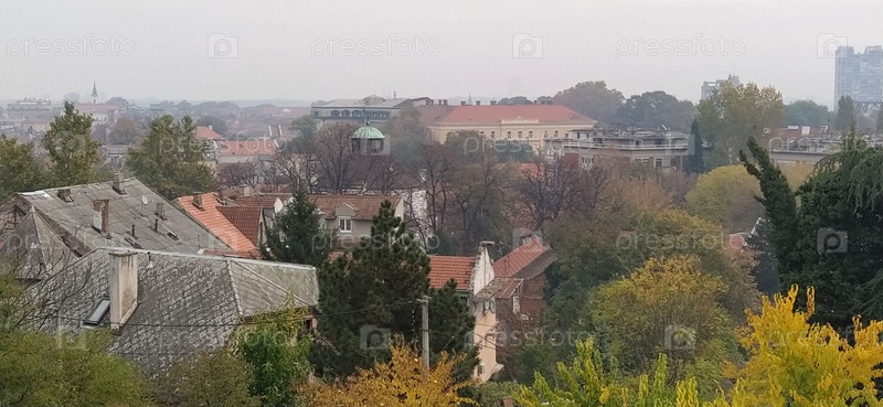 Панорамный вид на Земун с церковной башней в Белграде, Республика Сербия