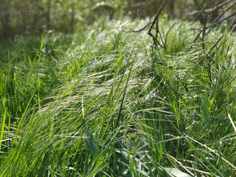 Высокая зеленая трава гнется на ветру. Черные сломанные ветки деревьев на заднем плане. Летний лес. Экология, концепция жизни и смерти