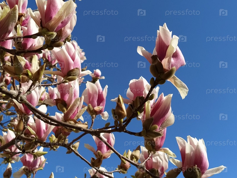 Красивые цветущие розовые цветы и бутоны магнолии на ветвях без листьев. Голубое небо и солнечный свет. Приглашение на свадьбу или открытка с 8 марта. Начало весны. Нежные белые лепестки