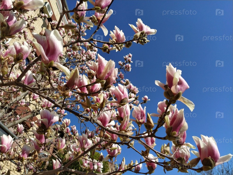 Красивые цветущие розовые цветы и бутоны магнолии на ветвях без листьев. Голубое небо и солнечный свет. Приглашение на свадьбу или открытка с 8 марта. Начало весны. Нежные белые лепестки