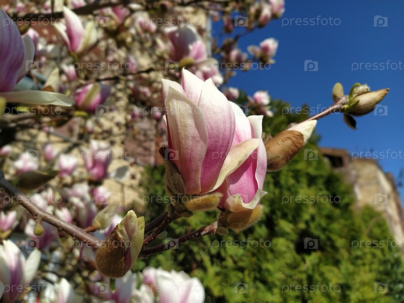Красивые цветущие розовые цветы и бутоны магнолии на ветвях без листьев. Голубое небо и солнечный свет. Приглашение на свадьбу или открытка с 8 марта. Начало весны. Нежные белые лепестки
