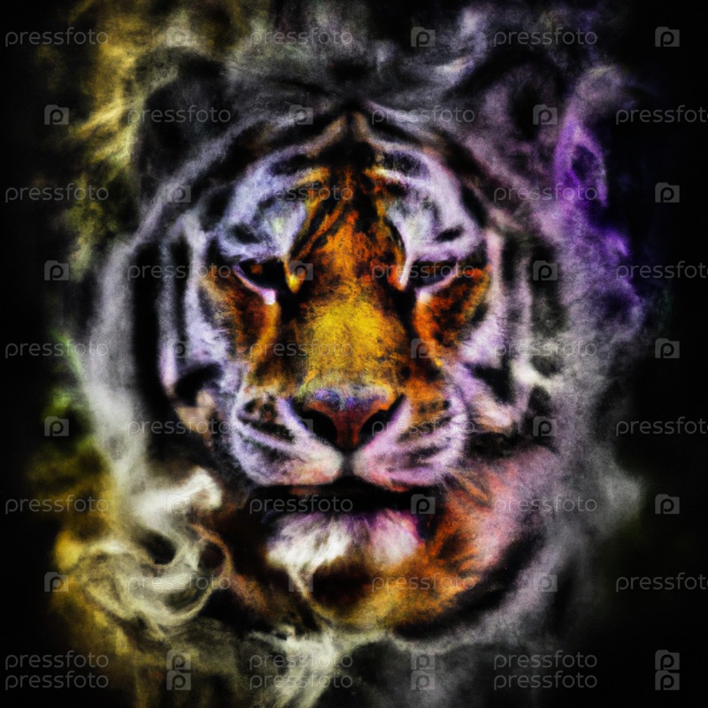 Иллюстративный портрет взрослого уверенного в себе самца тигра. Коллаж тигра на черном абстрактном фоне, животное дикой природы. Оранжевый, черный, фиолетовый и белый цвет. Дым или туман вокруг головы