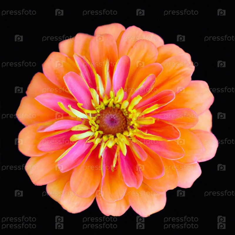 Цинния, род однолетних и многолетних трав и полукустарников семейства Астровые. Закройте розовые оранжевые желтые экзотические цветы, выделенные на черном фоне. Цветок вид сверху