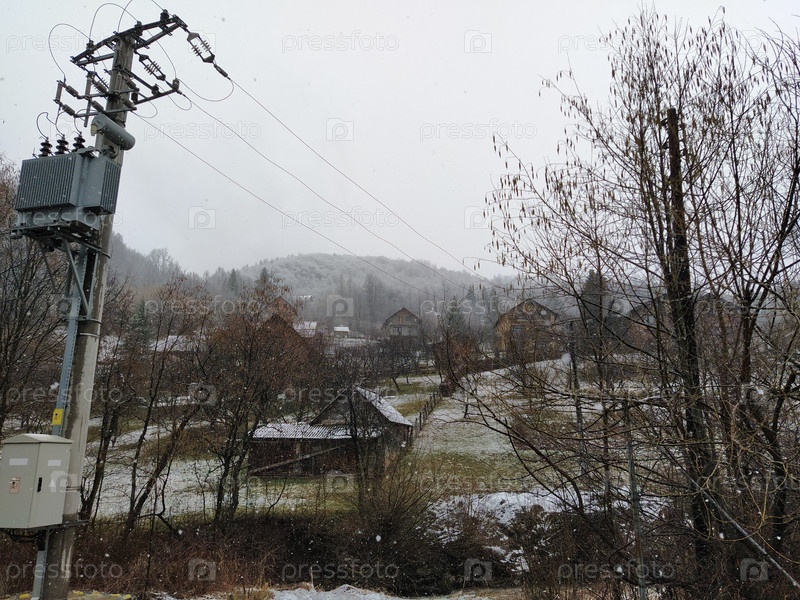 Линия электропередач в сельской местности. Опасность для жизни, если вы заберетесь внутрь или коснетесь руками. Горы и холмы в Боснии и Герцеговине. Сельская местность с двухэтажными частными домами. Большие белые снежинки