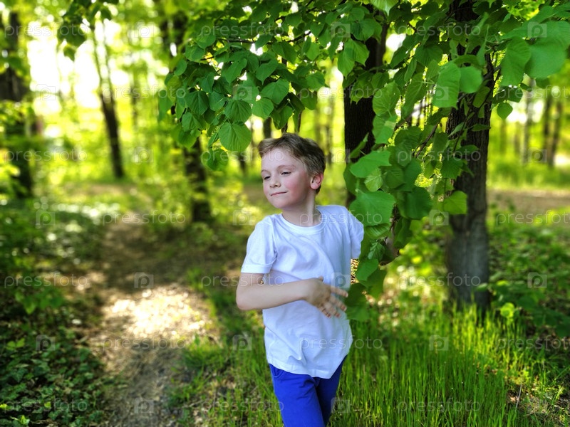 Красивый милый мальчик со светлыми волосами и румяными щеками танцует в лесу. Он делает реверансы и жестикулирует. Жесты. Ребенок одет в белую рубашку. Липы в городском парке