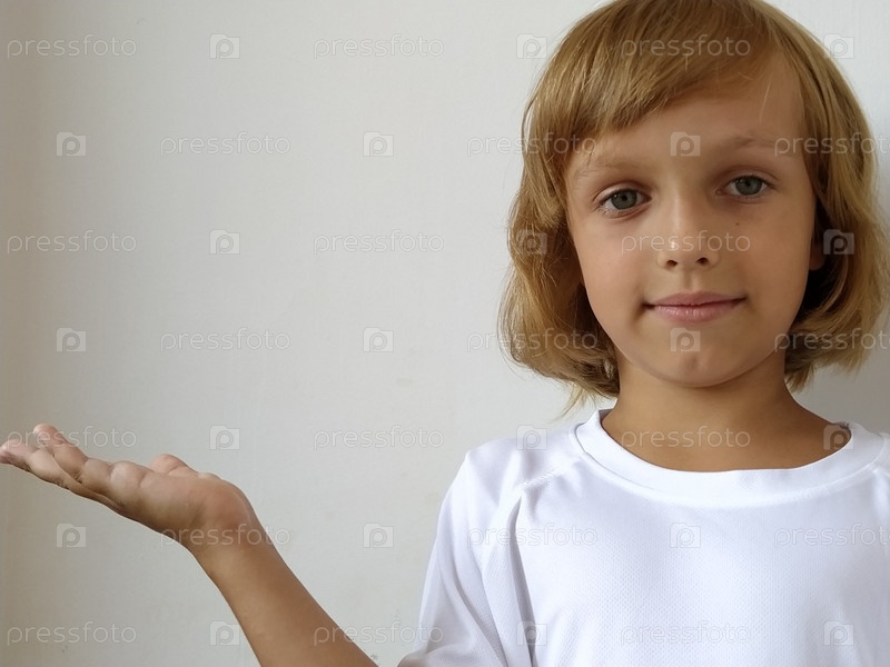 Маленькая милая девочка 6-7 лет со светлыми волосами выражает эмоциональную радость и улыбку на белом фоне. Ребенок с загорелой кожей. Белая футболка. Скопируйте пространство. Девушка рукой указывает на что-то