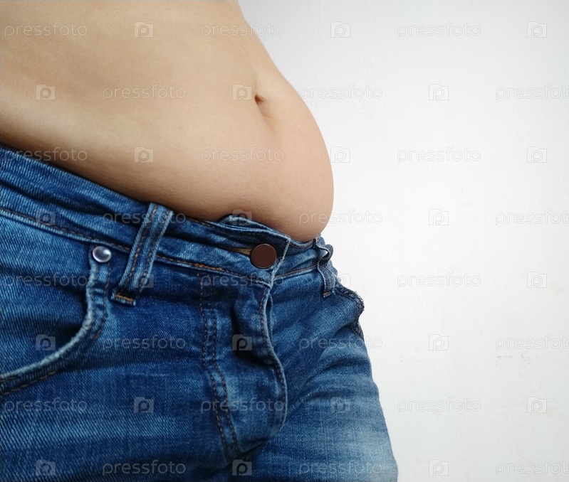 Обвисший живот. Складки кожи и жира по бокам нависают над талией джинсов. Фигура, испорченная перееданием или беременностью. Ожирение и диабет. Белый фон. Целлюлит дряблых мышц