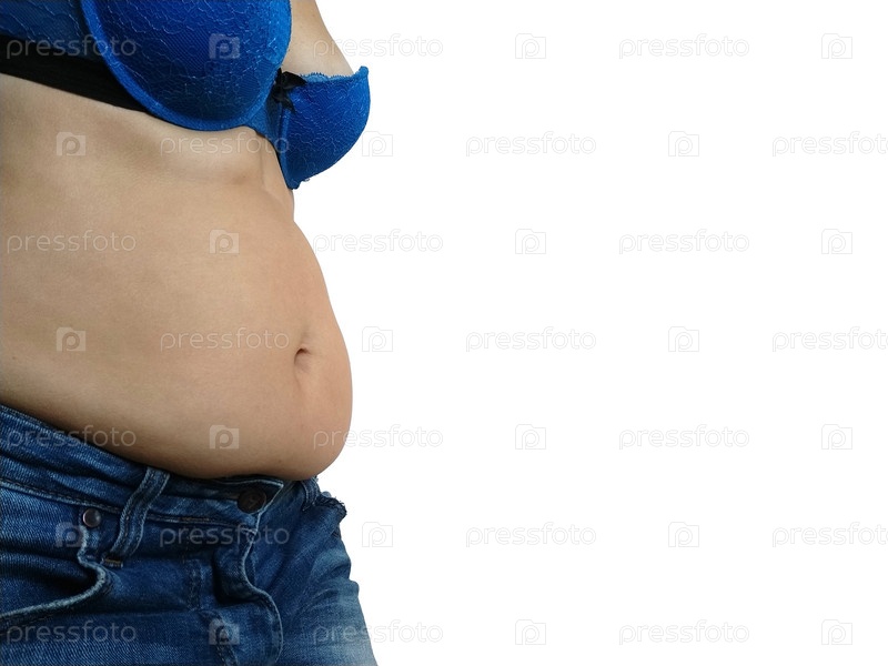Обвисший живот. Складки кожи и жира по бокам нависают над талией джинсов. Фигура, испорченная перееданием или беременностью. Ожирение и диабет. Белый фон. Дряблые мышцы от целлюлита