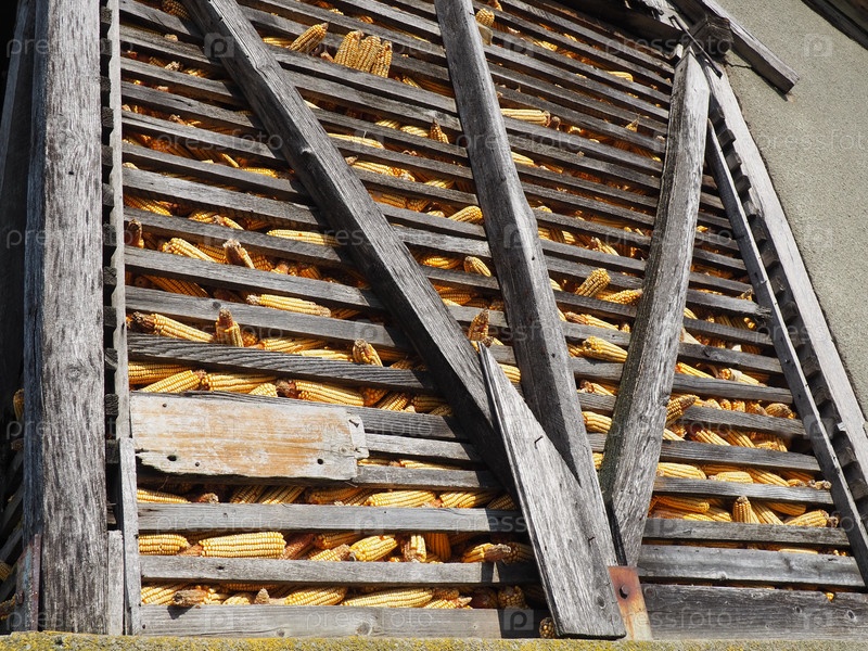 Хранение кукурузы. Строительство или деревянный сельский сарай с урожаем. Вентилируемое помещение для хранения овощей. Сельскохозяйственная тема, сельская жизнь. Корм для животных, свиней, овец, коров и лошадей