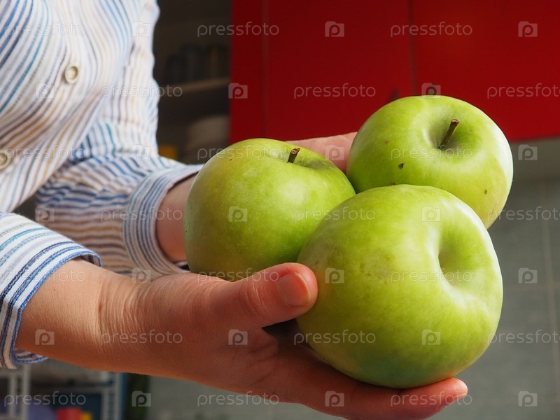 Яблоки в руке. Женщина держит в руках три зеленых яблока и предлагает их зрителю. Органическая еда. Свежие фрукты для еды. Большое кислое яблоко. Белая рубашка с полосками. Кухня с красной мебелью