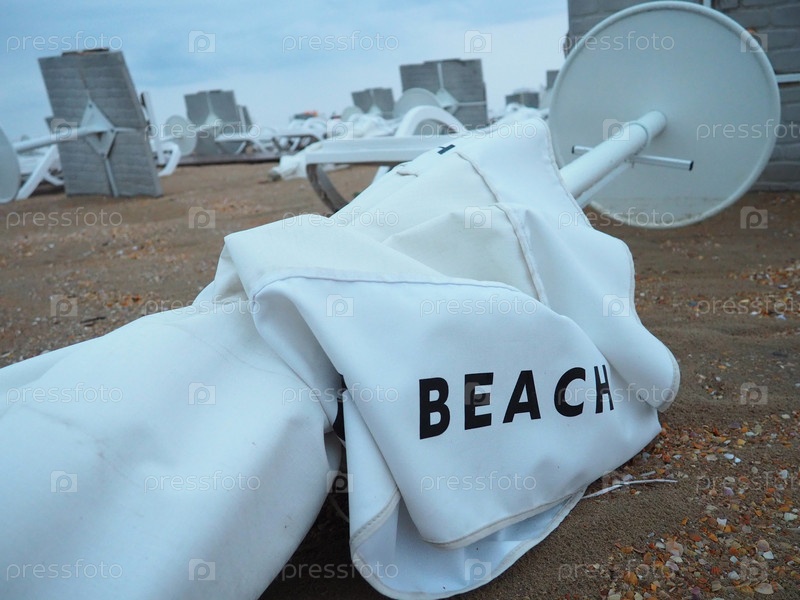 Пляжный зонт лежал в сложенном виде на песчаном пляже после плохой погоды. Буря в море. Конец пляжного сезона из-за тайфуна и циклона. Лежаки, зонтики и гостиничная мебель. Пляжное слово, написанное на белом