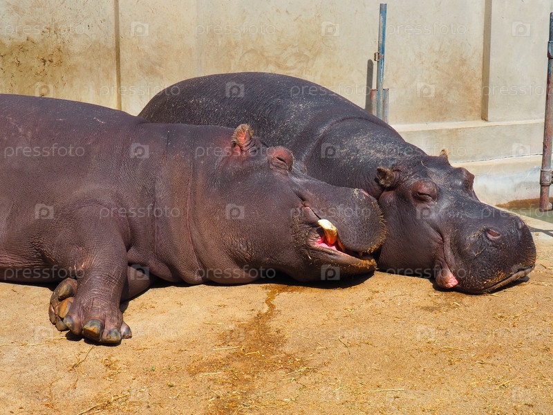 Бегемоты лежат и спят. Бегемоты мужского и женского пола, супружеская пара. Животное оскалило клыки и пускает слюни во время сна. Бегемоты греются на солнышке. Промокшая стена. Зоопарк Белграда, Сербия