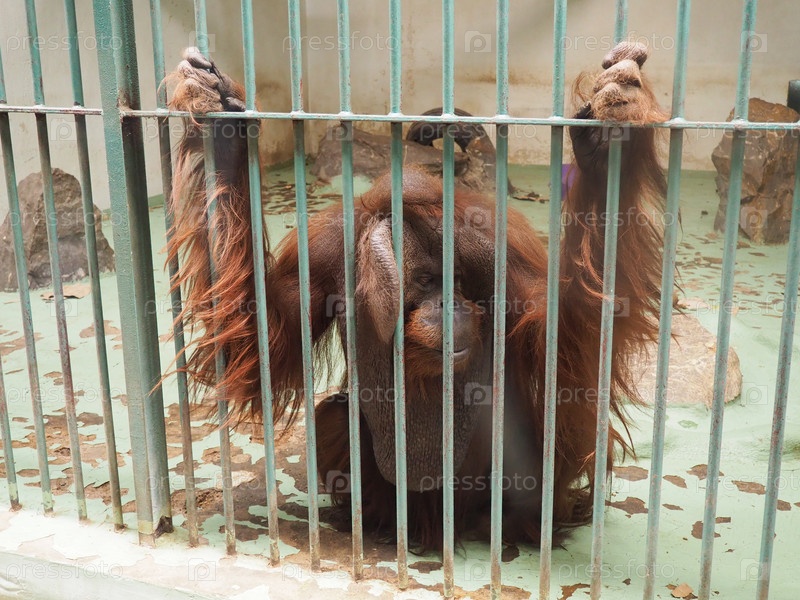 Грустный орангутанг за решеткой. Орангутаны, орангутанг — лесной человек, понго — род древесных обезьян, один из наиболее близких к человеку по гомологии ДНК