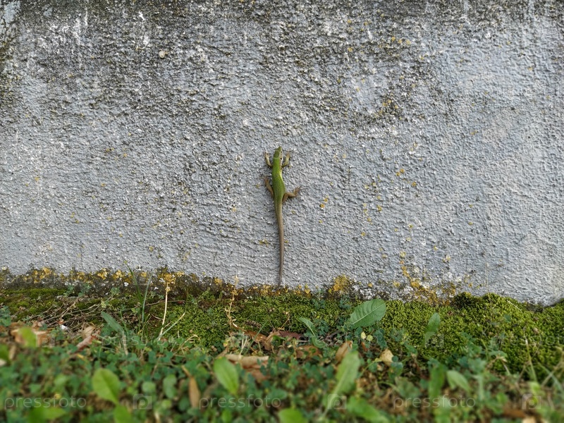 Зеленая красивая ящерица сидит на стене и позирует, глядя в камеру. Мерцающая разноцветная кожа ящерицы и длинный хвост. Сербия, Балканы