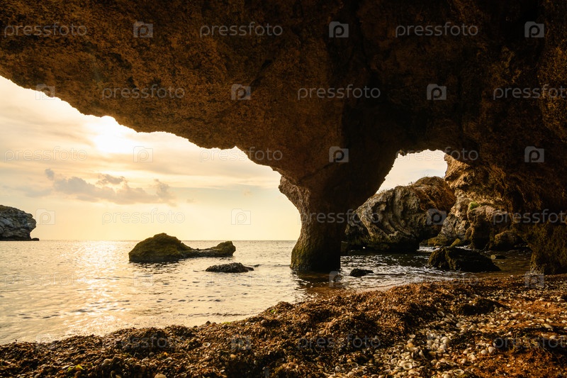 Вид на красивое и море из огромной темной пещеры в Крыму