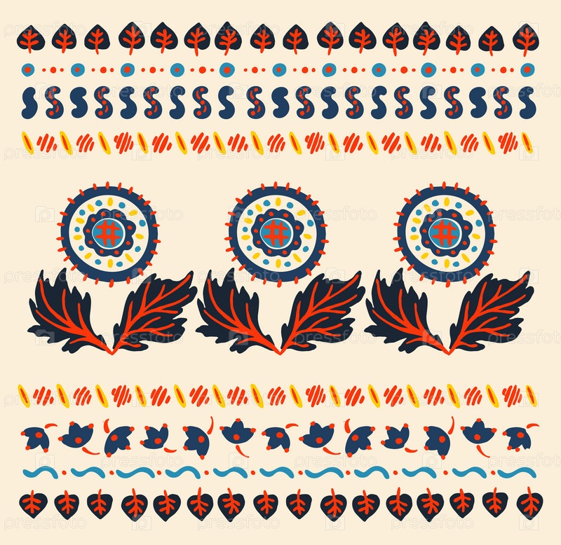 Набор этнических элементов. Бордюр представляет собой полосу с цветами, листьями, ветками, вензелями. Народная вышивка. Славянский, украинский, русский мотив. Хохлома, матрешка, дымковская игрушка. Мексиканский, индийский, цыганский ковер. Вязаное кружево