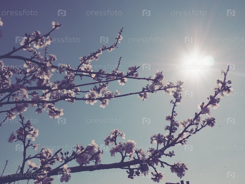 Цветы на ветвях на фоне неба и солнца. Ретро стиль. Красивые розовые цветы и бутоны. Вишневое, яблочное, сливовое, персиковое или абрикосовое южное дерево. Весенний сад. Солнечная погода