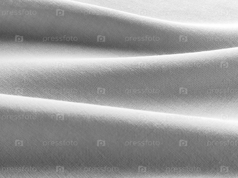 Красиво сложенная по горизонтали ткань. Мягкие приятные волны и воланы на текстиле. Крупный план. Драпировка для штор, ткань для пошива одежды или обивки. Черно-белое монохромное изображение