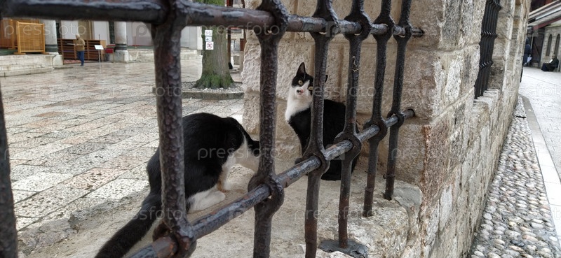 Сараево, Босния и Герцеговина, 8 марта 2020 г., кошки в Сараево. Две черно-белые кошки за металлической решеткой в мечети Галеба. Мраморный забор с решеткой