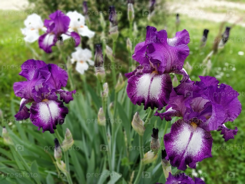 На клумбе цветут красивые лиловые и белые ирисы. Несколько ярких цветков. Закрученные нежные пестрые лепестки. Зеленая листва на заднем плане
