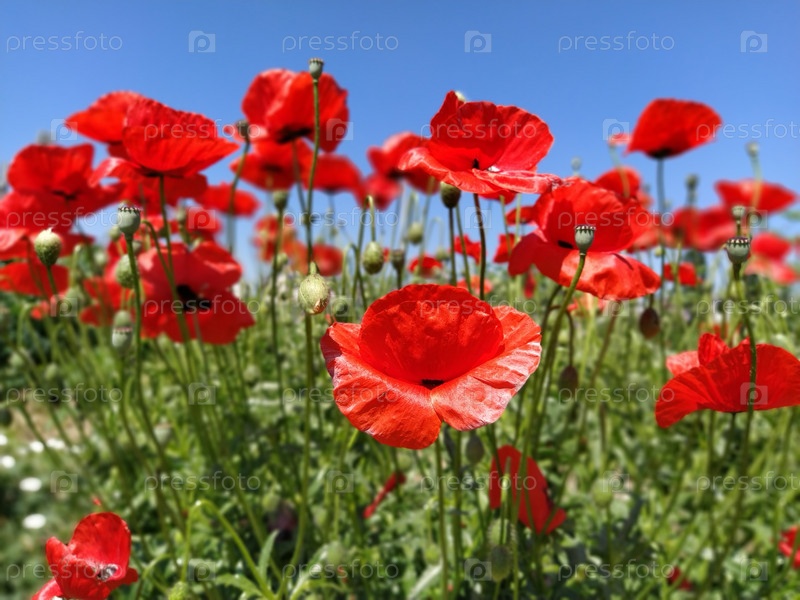 Цветущие ярко-красные маки на поле. Дикие красивые цветы. Голубое небо на заднем плане. Нежные лепестки цветов блестят на солнце. Распускание бутонов мака