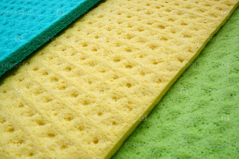 Набор чистящих салфеток, салфетки из микрофибры или губки для кухни, три разноцветные салфетки. Губчатые волокна губки текстура узор поверхности крупным планом фон. Зеленый, синий и желтый