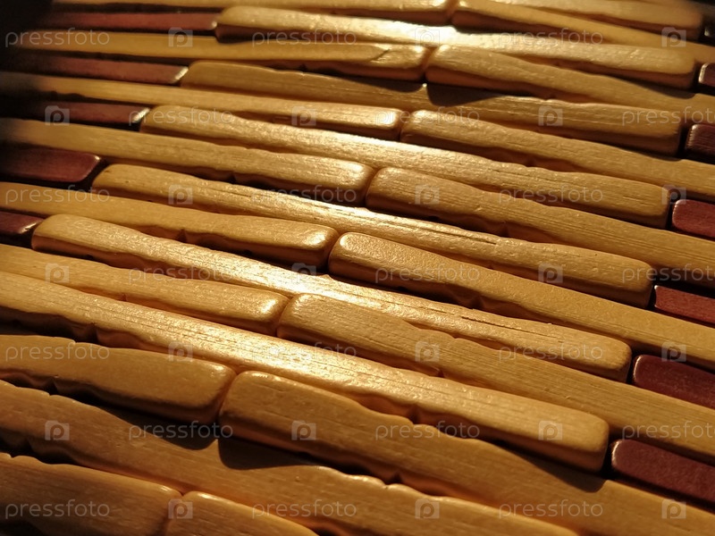 Тростник или деревянная циновка. Коврик представляет собой коврик под жаркое. Вязаные палочки из обработанного дерева с закругленными краями. Крупный план. Желтый, коричневый и бежевый цвета. Боковое освещение. Традиционная текстура бамбуковой подушки