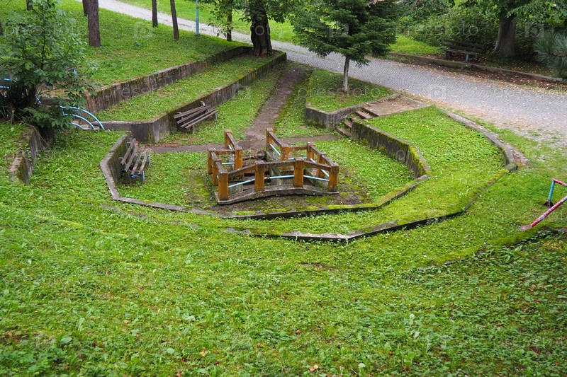 Баня Ковиляча, Лозница, Сербия. Гора Гучево, парк и лес. Источник минеральной серно-железистой воды Ракина Чесма Чесма. Родник у дороги на Гучево. Бетонный забор и лестница