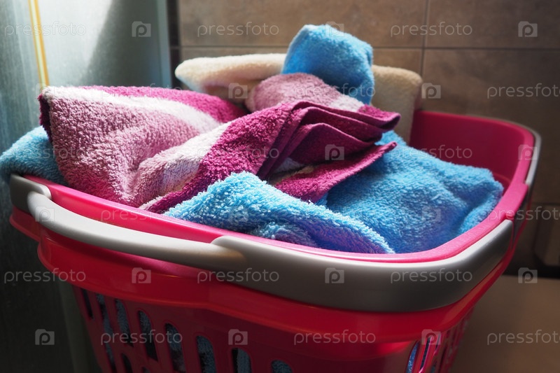 Полотенца в корзине для белья. Синие и розовые хлопковые махровые полотенца брошены в розовую пластиковую корзину. Уборка. Хранение и разделение белья перед стиркой. Свет сверху из открытого окна