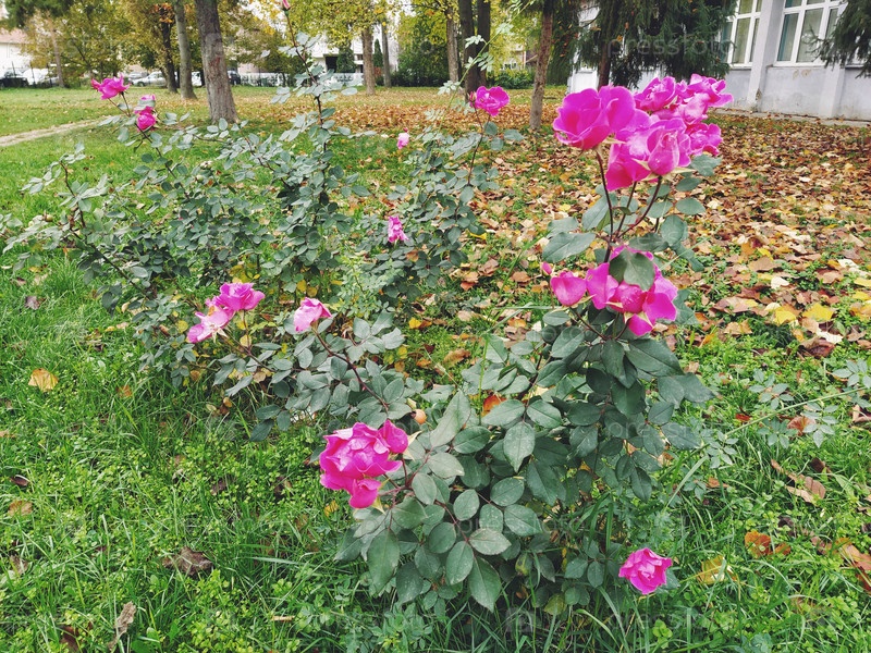 Кусты розовых роз в саду. Садоводство, растения для ландшафтного дизайна. Осеннее украшение сада, садового участка, дачи. Сочетание роз и желтых листьев. Морозоустойчивые растения
