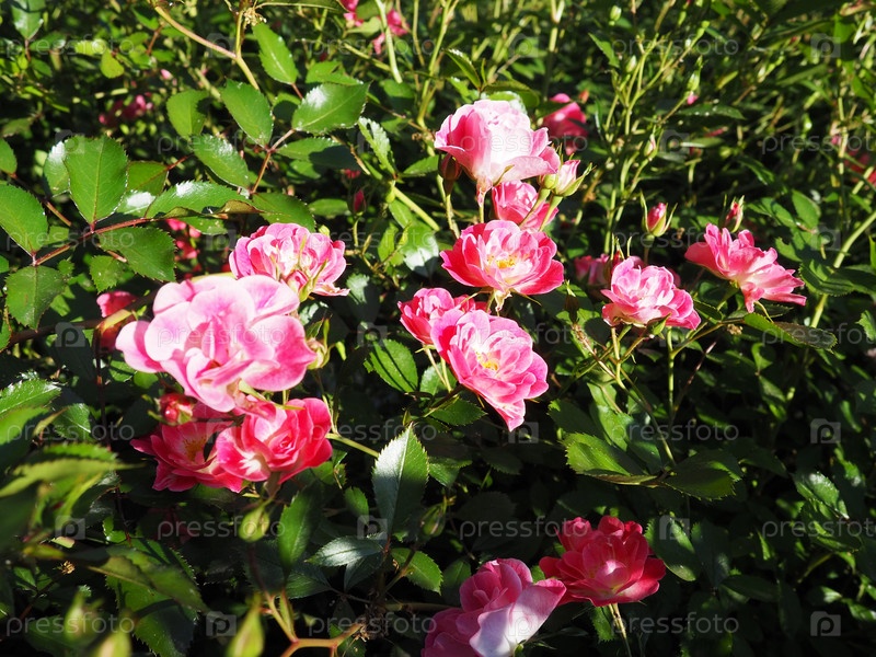 Брызги розовых роз. Красивые нежные цветы роз на фоне зеленых листьев, бутонов и шипов. Мягкий фокус. Открытка. Стрельба в золотой час. Цветущий розарий