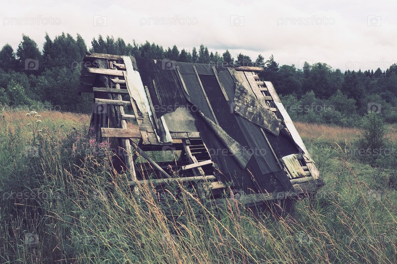 Старый заброшенный унылый колодец или дом в селе Нырки, Карелия. Односкатная деревянная крыша с насыпным кровельным материалом. Поле с луговыми цветами и лес вдали. Высокие травы. Умирающие деревни